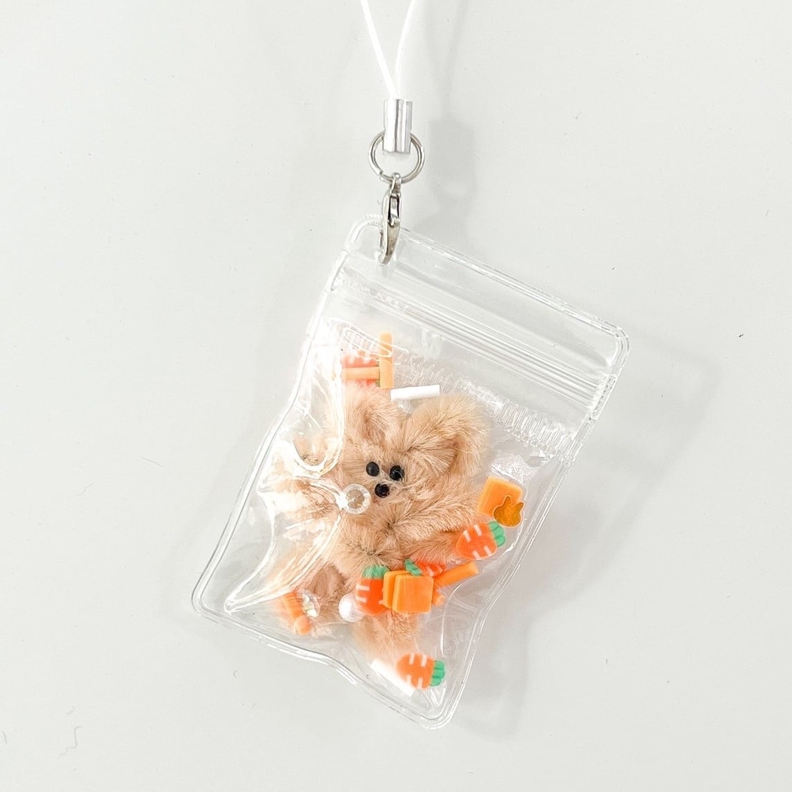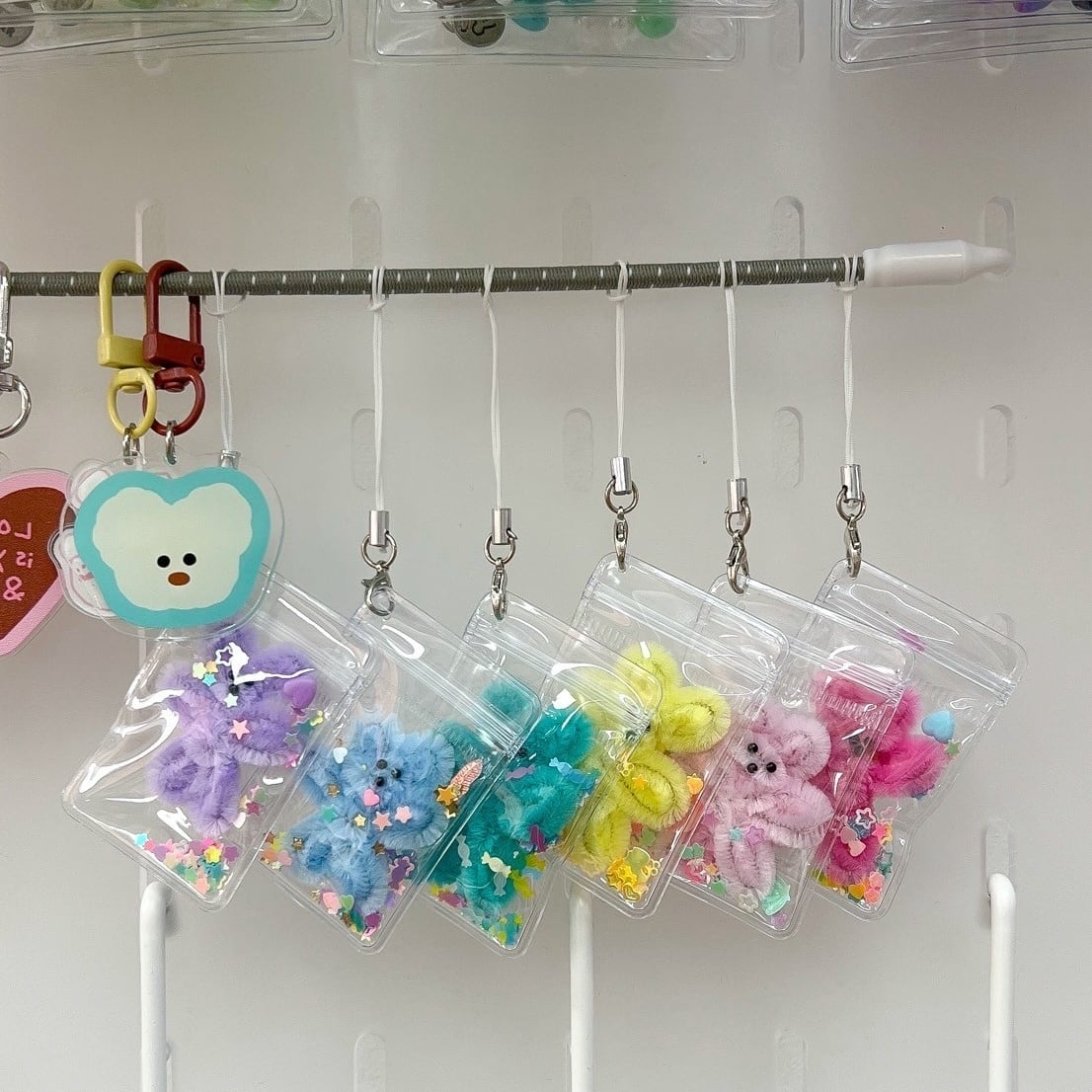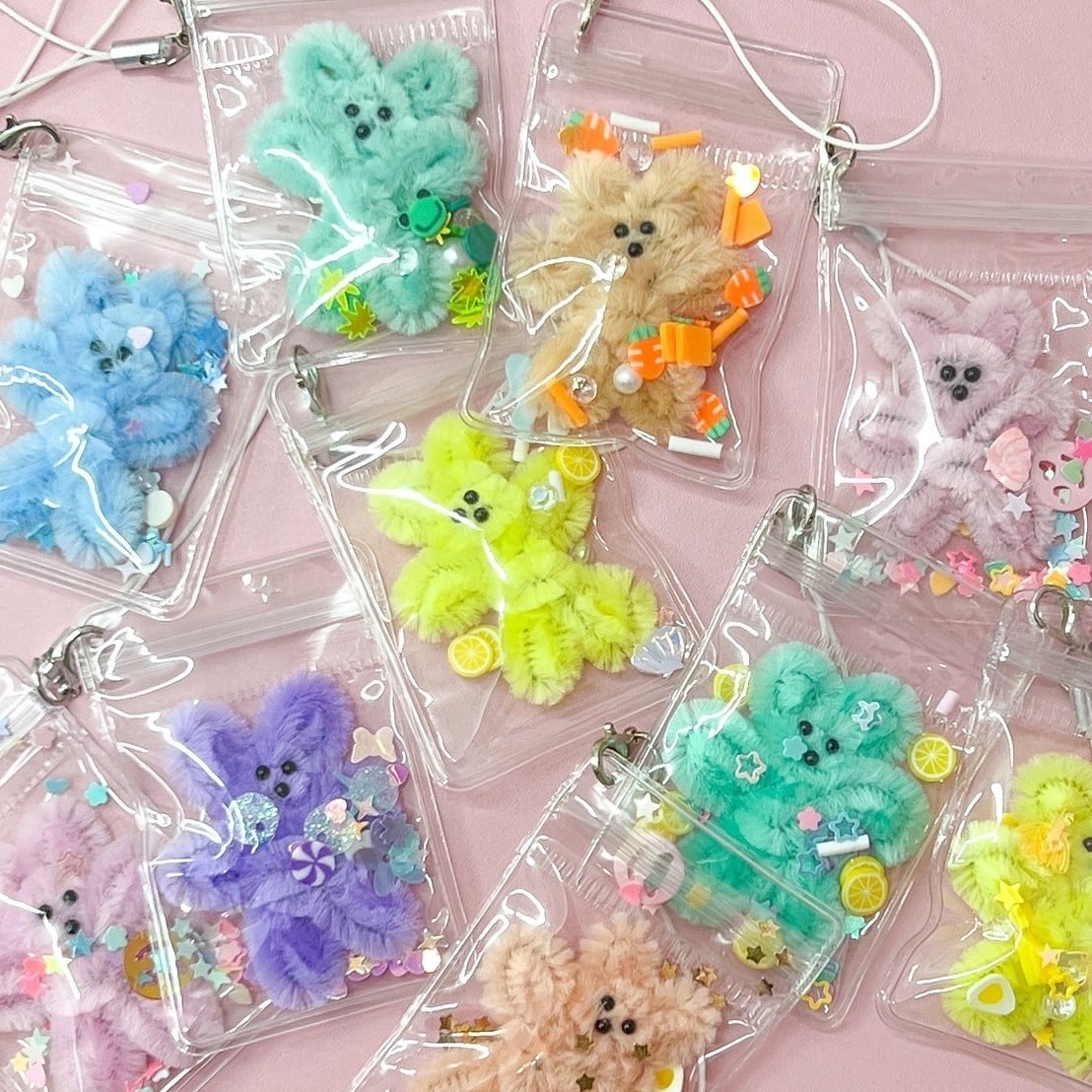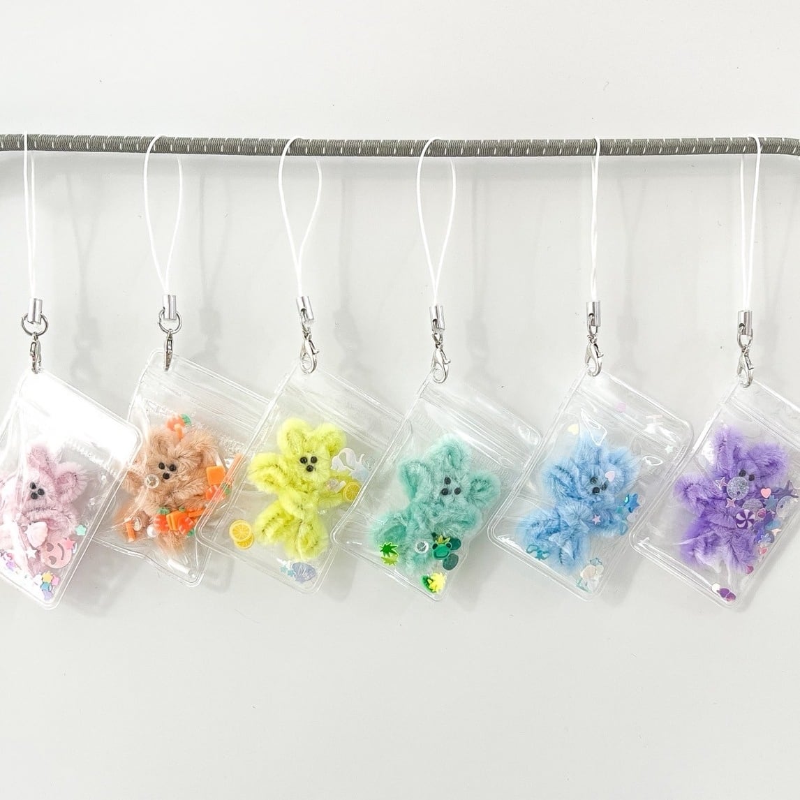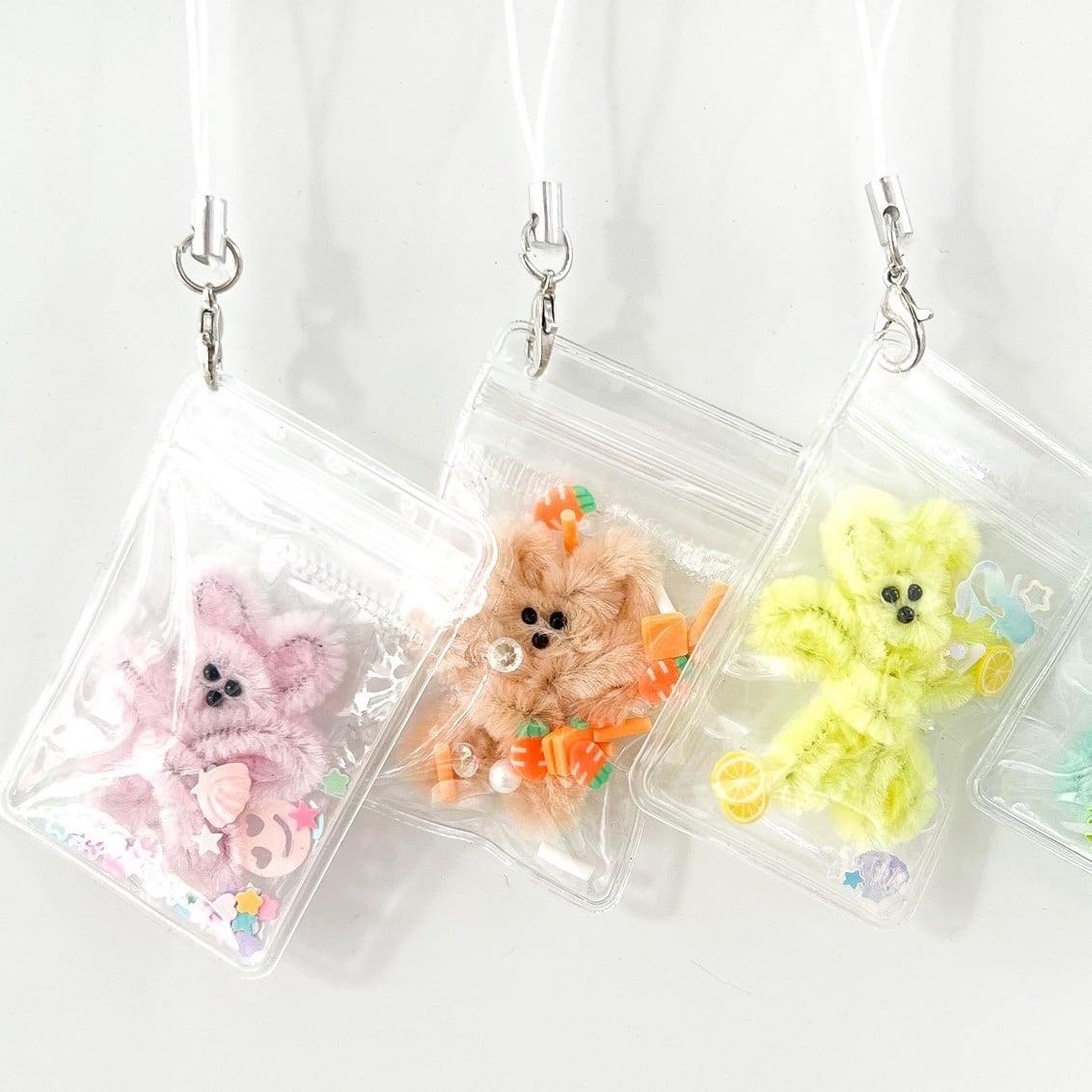 ミニミニサイズはトレンドのパッケージデザインで、小さなサイズのPVCクリアポーチの中にPETITBEARとさまざまな色や形をしたビーズやホログラムが一緒に入っています。