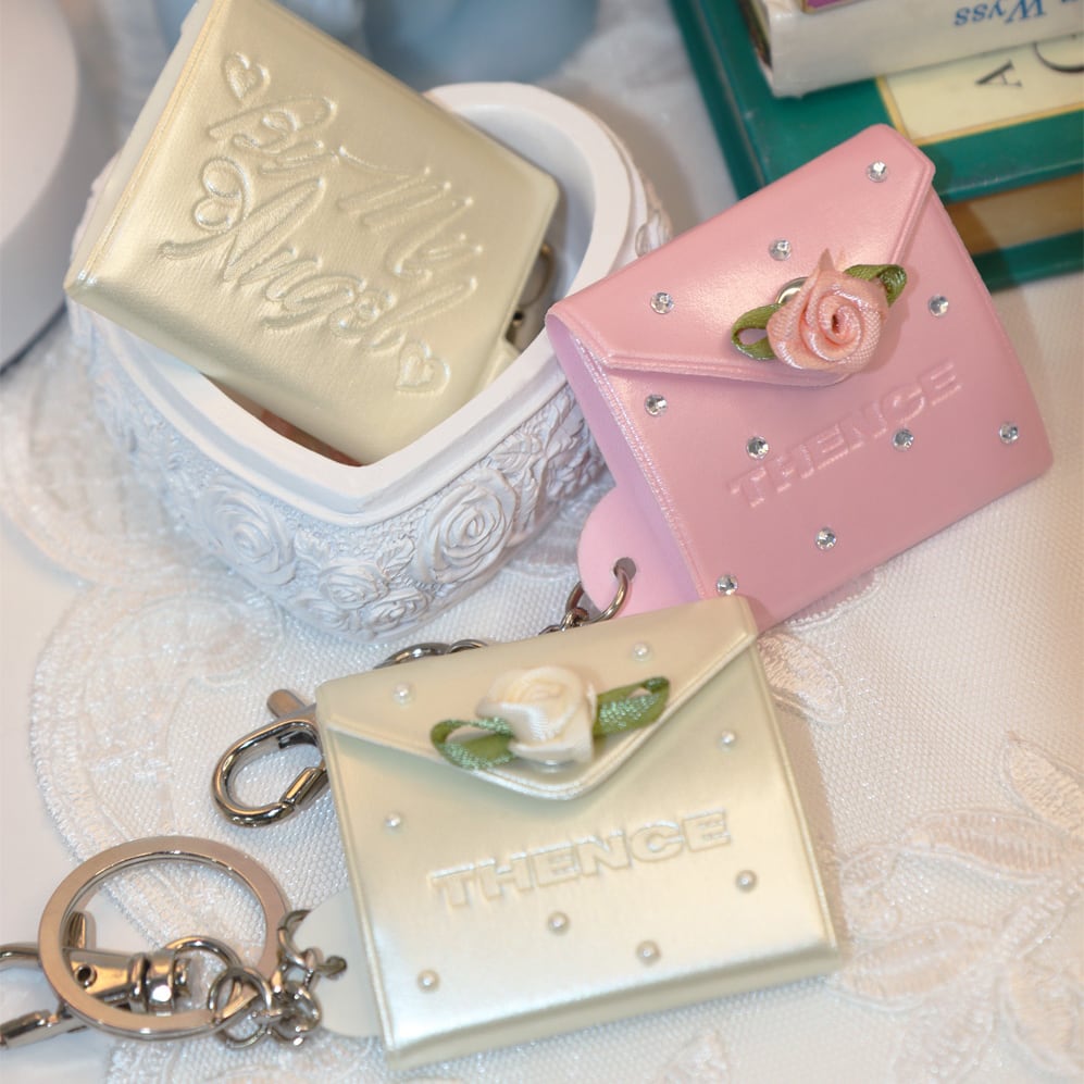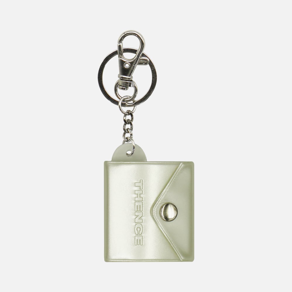 微粒子パールが際立つ素材に型押しされたTHENCEロゴが魅力のフォトホルダーキーリング。