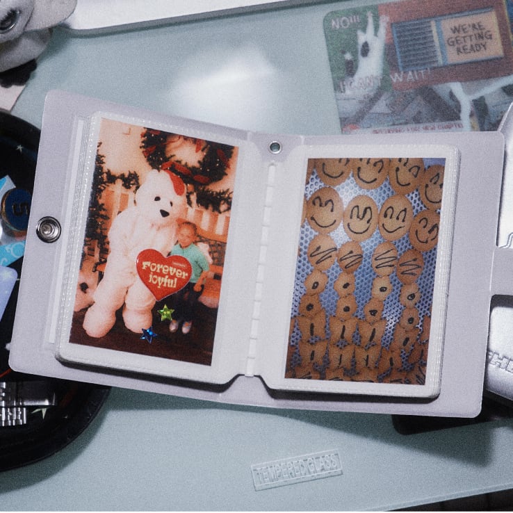 写真、名刺、ミニポラロイドなどを収集することができるエナメル素材のコレクトブックです。