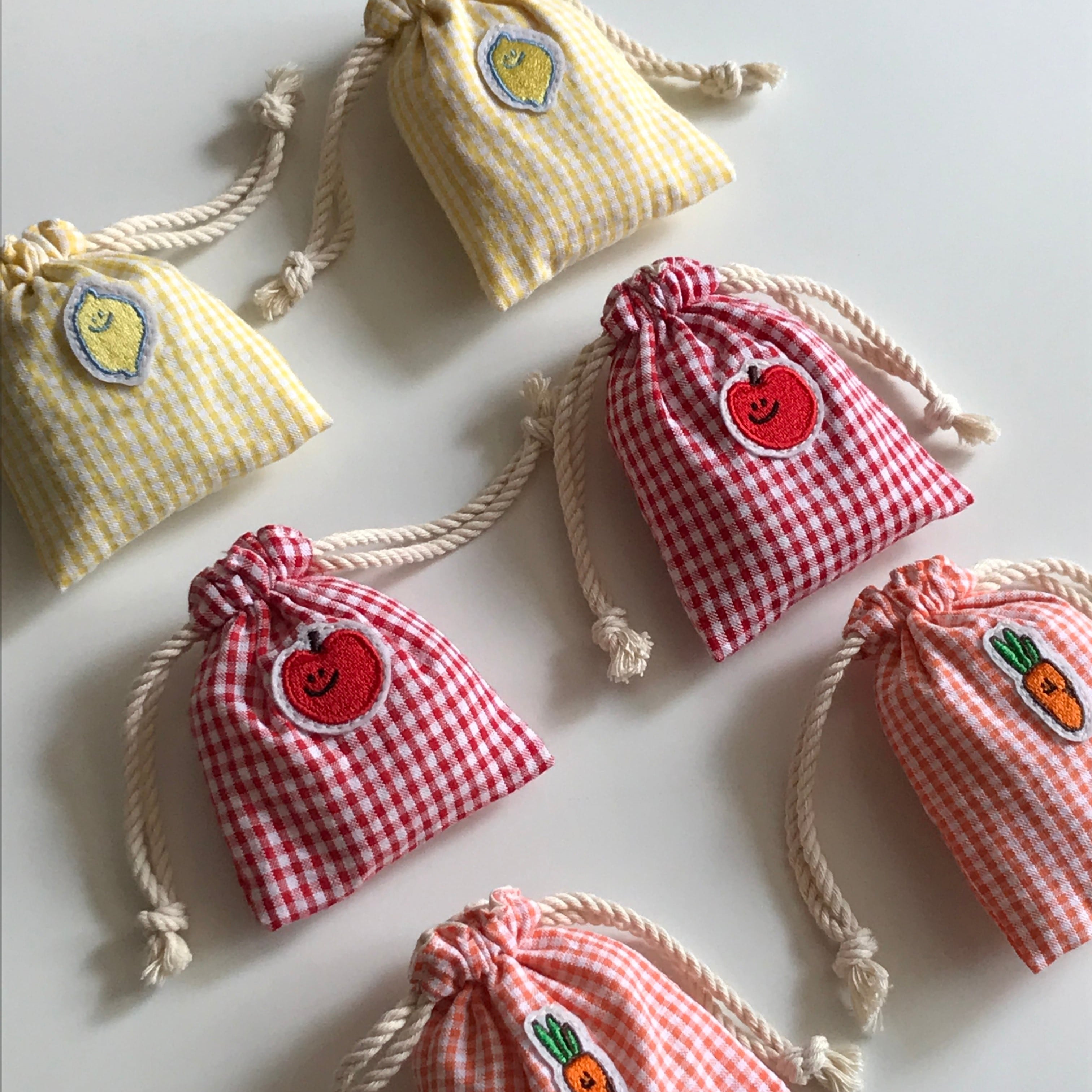 second morningの人気キャラクター「レモニ」「アップル」「にんじん」のワッペン付きのミニ巾着ポーチ。