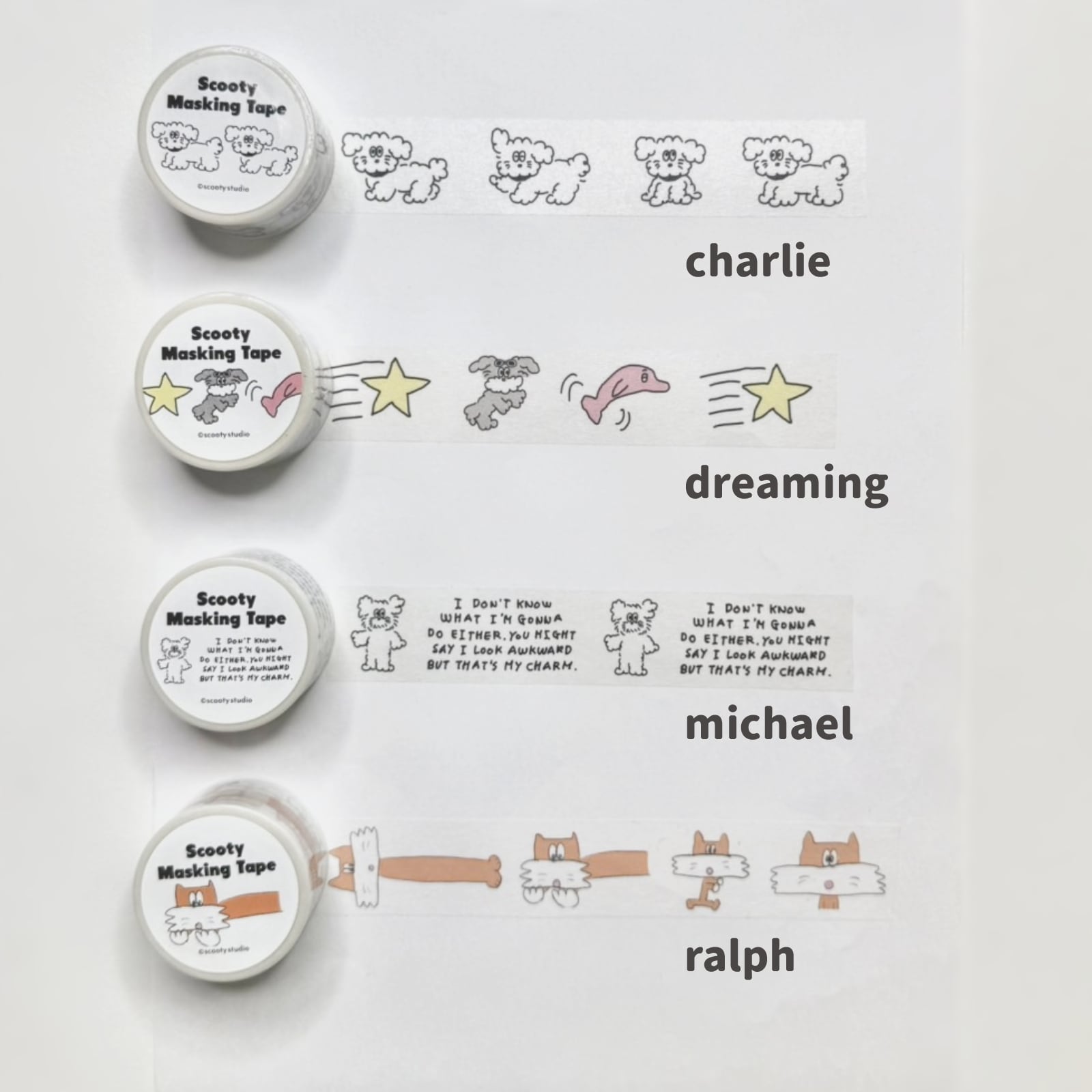 scooty studioのシグニチャーキャラクターである「charlie」、「michael」、「bunny」が描かれたマスキングテープ。